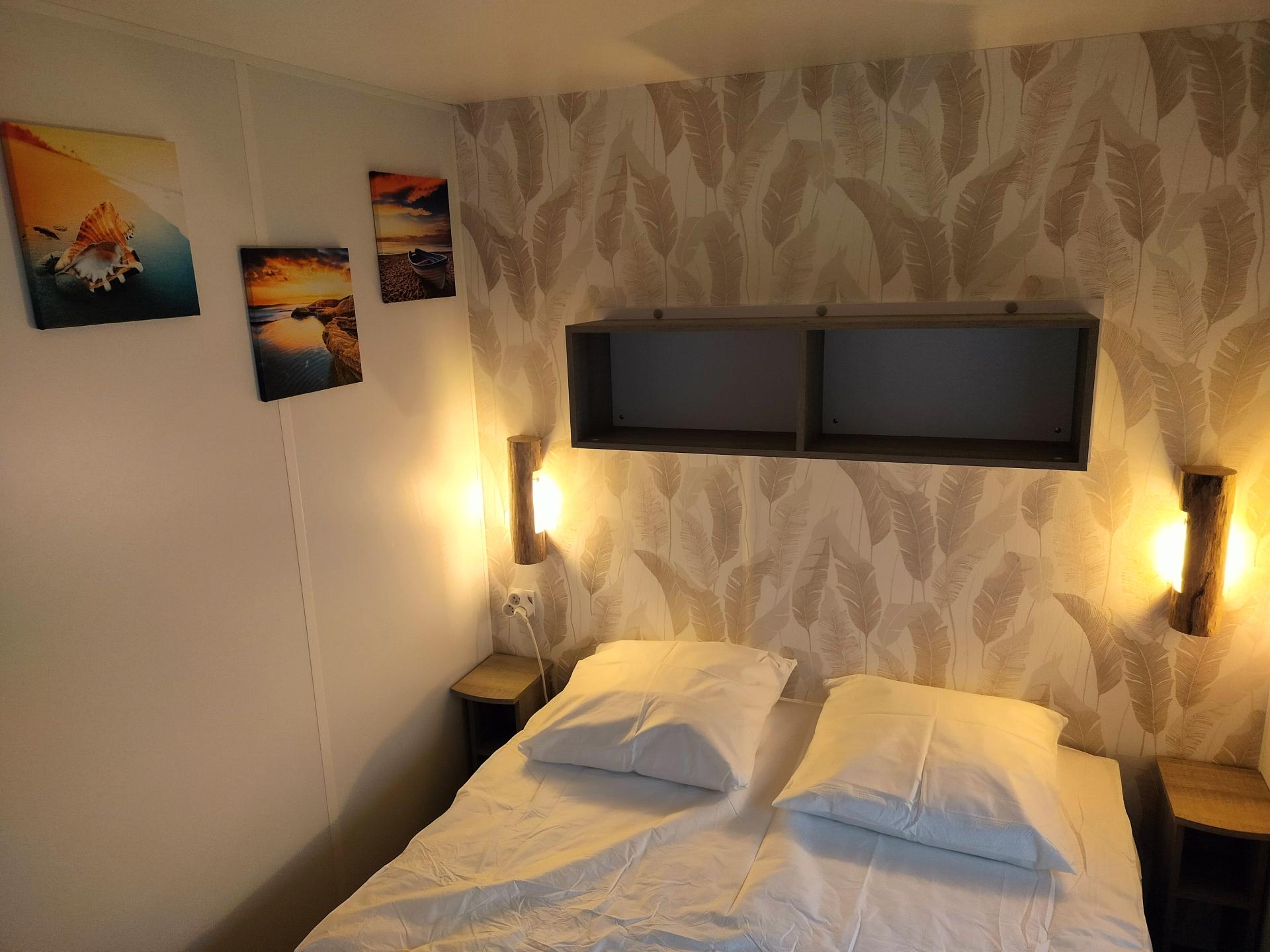 Notre mobil-home de 32m2, climatisé, pourra accueillir 7 personnes grâce à ses 3 chambres (une avec lit double, une avec lits superposés 2 places en bas et une en haut et une avec lits simples superposés).